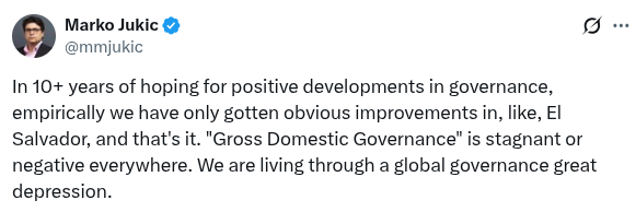 在经济和政治规则的进步方面也存在类似的问题,在所谓的“动态”资本主义自由主义下,这些规则也停滞不前。问题在于,无论是城市规模还是国家规模,新的和更好的经济和政治规则的制定同样没有强大的利润动机。它绝对没有初创公司甚至许多(但不是全部)文化方面所拥有的快速实验循环。