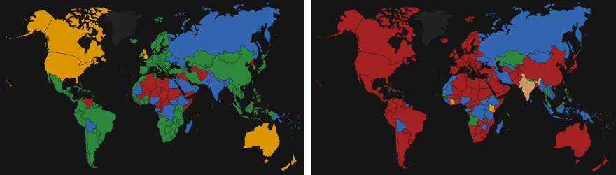 左图:新加坡人可以免签(短期访问)去的地方。右图:印度人可以免签去的地方。